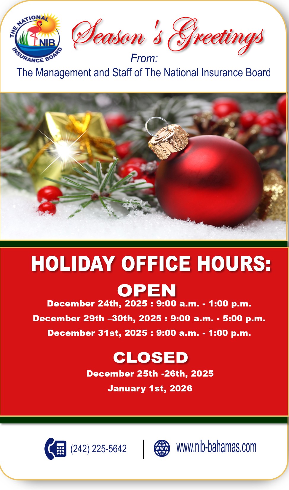 Season’s Greetings from The Management and Staff of The National Insurance Board.December 24, 2025HOLIDAY OFFICE HOURS:Readmore…