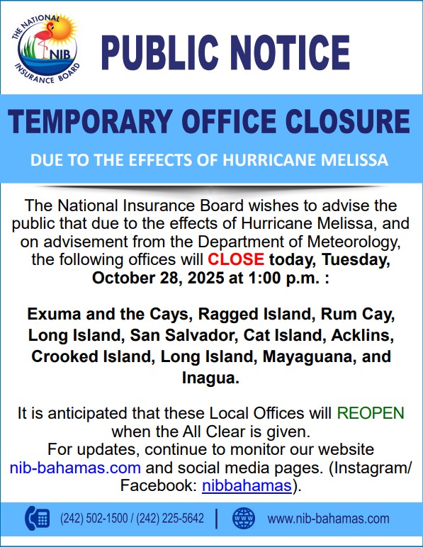 The National Insurance Board wishes to advise the public that due to the effects of Hurricane Melissa, and on advisement from the Department of Meteorology, the following offices will CLOSE today, Tuesday, October 28, 2025 at 1:00 p.m.: